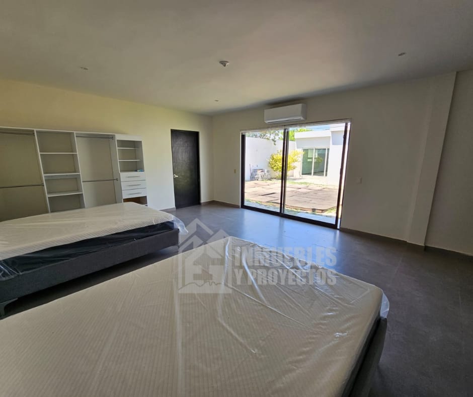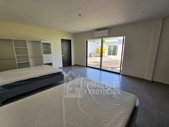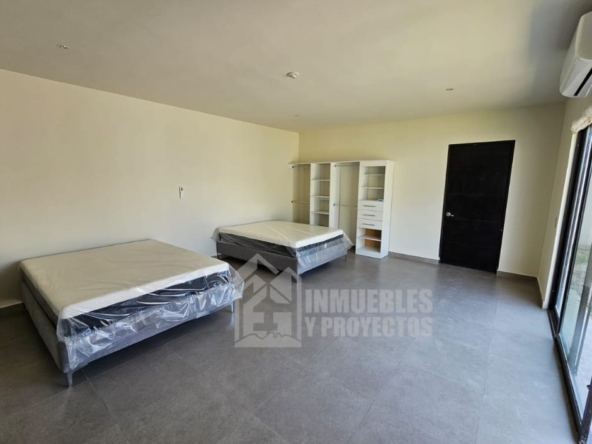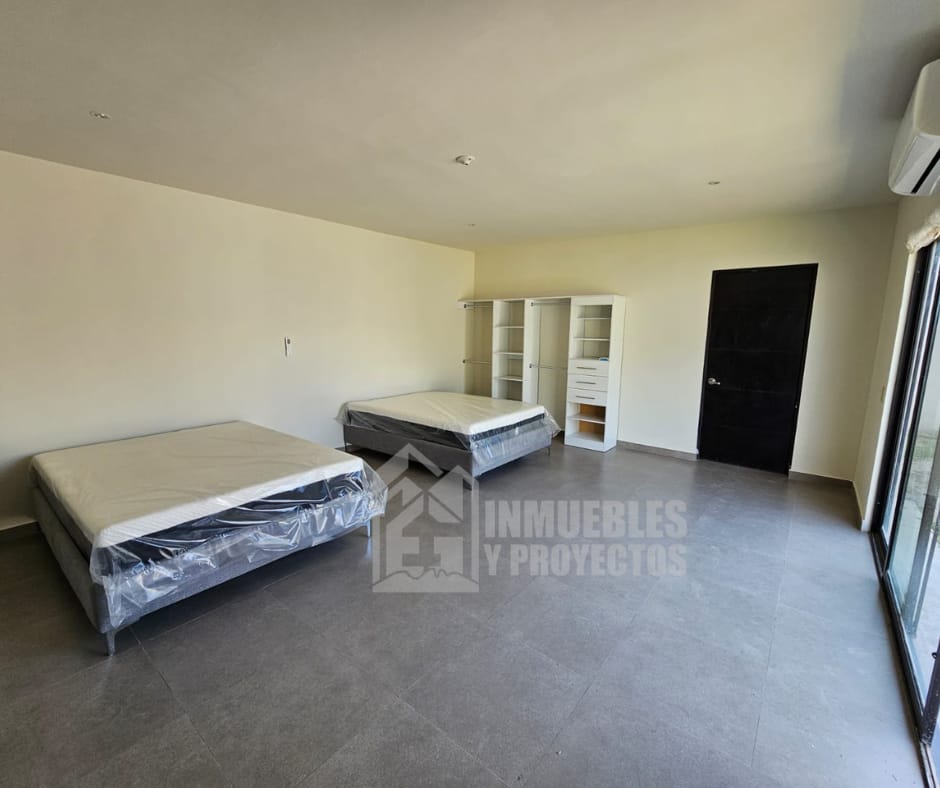 Recámara exterior cuenta con 2 camas matrimoniales con base y colchón (nuevos) 2 roperías, minisplit y baño completo.